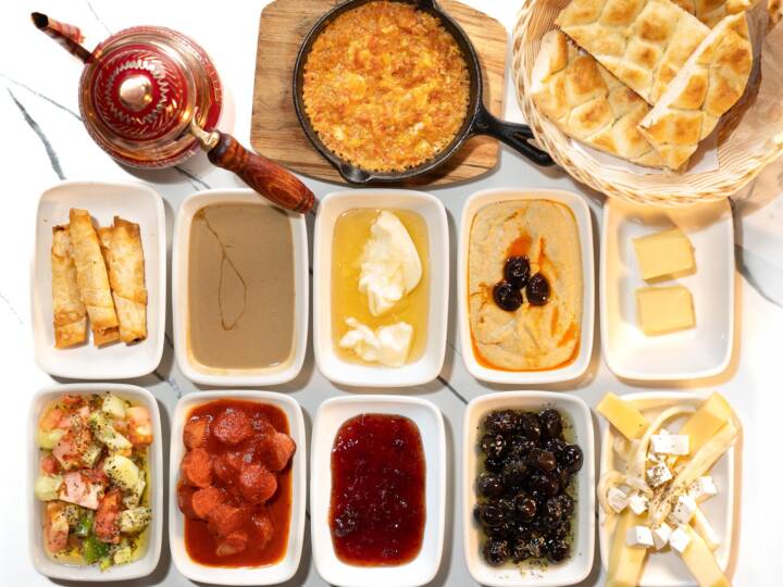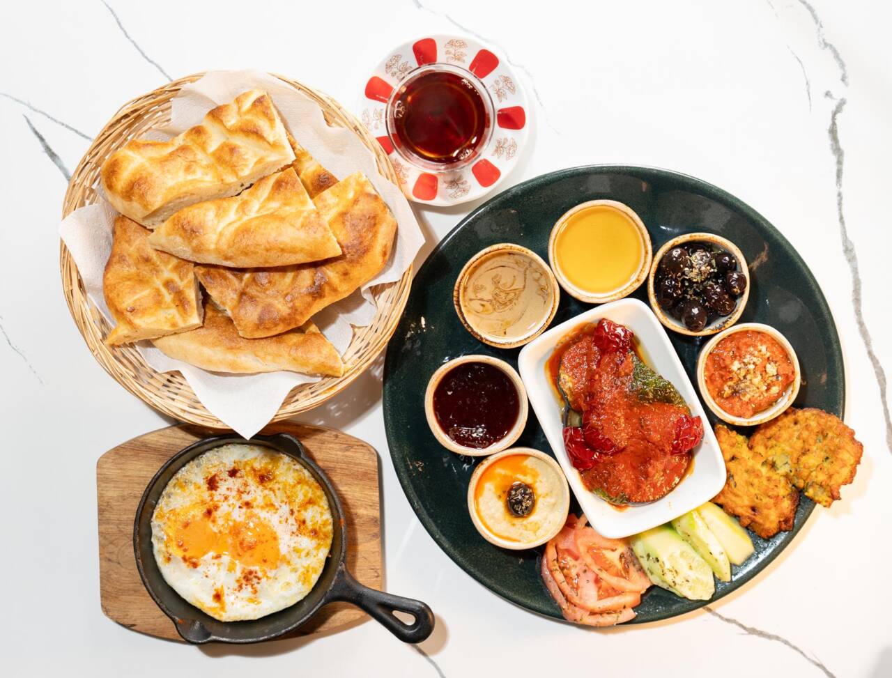 Dwa jajka sadzone podawane z sałatką z ogrodu, dżemem, miodem, oliwkami, muhammarą (orzechy włoskie, bułka tarta, przyprawy, pasta z pieczonej papryki), warzywnym kotlecikiem (bakłażan, zielona papryka w sosie pomidorowym), humusem (gotowana ciecierzyca, czosnkowy sos tahini, przyprawy, tahini z melasą winogronową, plackiem z cukinii oraz pitą).