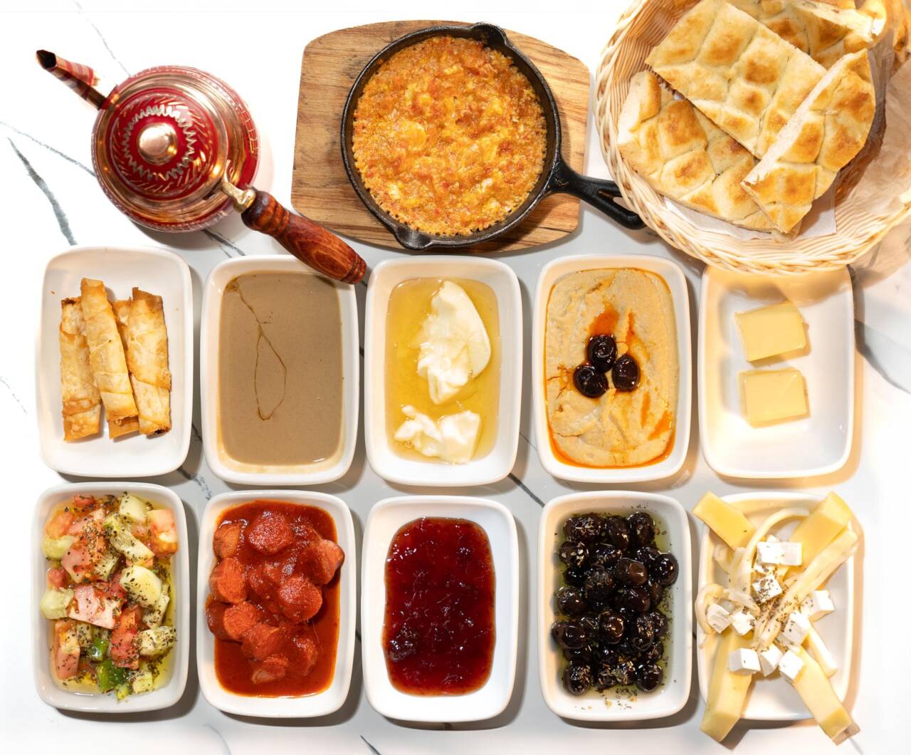 Sałatka z ogrodu, kiełbaski w sosie pomidorowym, smażone ruloniki z ciasta filo nadziewane białym serem, deska serów, kajmak, miód, dżem, oliwki, masło, pita. Do wyboru: omlet naturalny lub menemen (jajecznica z pomidorami i zieloną papryką).