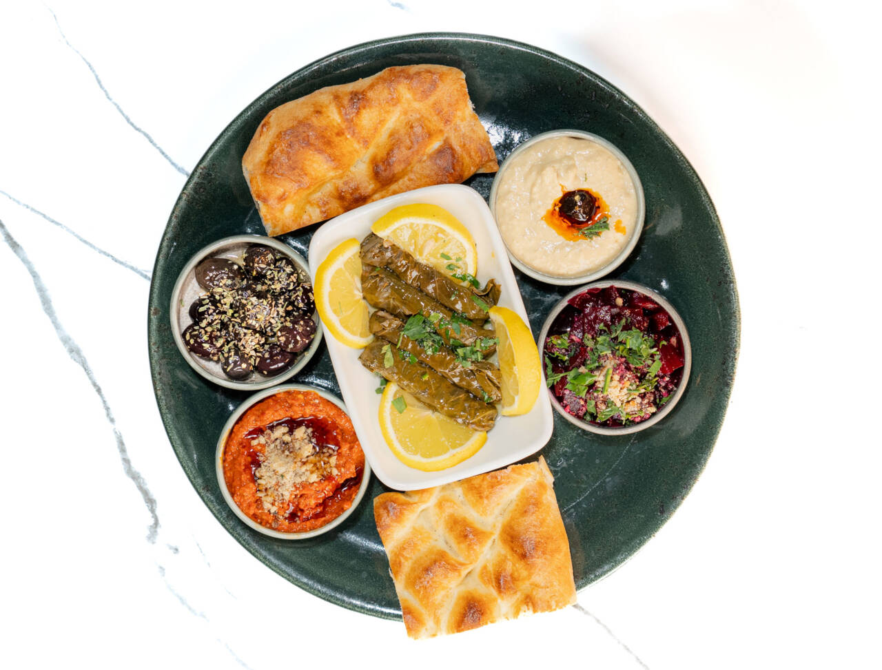 Hummus, liście winogron faszerowane, marynowane oliwki, muhammara, sałatka z buraków.